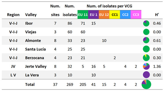 Vegetative Compatibility Groups (VCGs) and Shannon diversity index (H’) of isolates obtained from surveyed sites in the different valleys of the Villuercas–Ibores–Jara (V-I-J) district and in the Jerte Valley (JV) and La Vera (LV) districts.