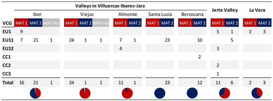The H’-index values (Figure 3) indicate that the greatest diversity in terms of VCGs was found in the Jerte Valley (H’ = 1.36). In the Villuercas–Ibores–Jara district, the diversity was lower in general, with the highest H’-index value corresponding to the Almonte valley (H’ = 0.61).