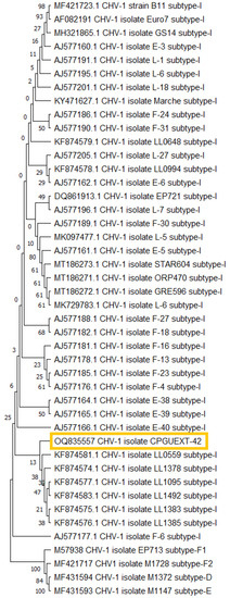 For the CHV1 subtype determination of isolates, the specific region of ORF-A was sequenced using primers hvep1/hvep2 [28] by StabVida laboratories (Caparica, Portugal). The assembled sequences were aligned using Clustal W [33]. The sequences of previously reported subtypes I, F1, F2, D and E deposited in the GenBank (Accession numbers: AF082191, M57938, MF421717, MF431594 and MF431593, respectively) as well as those of CHV-1 subtype I haplotypes [8,28,34] deposited in the GenBank were included for comparison purposes. The alignments were used to reconstruct the phylogenetic trees using the neighbour-joining method with nucleotide identity distances in program MEGA 11.0 [35]. Bootstrap analyses with 1000 replicates were performed to estimate the support for inferred phylogenies [36].