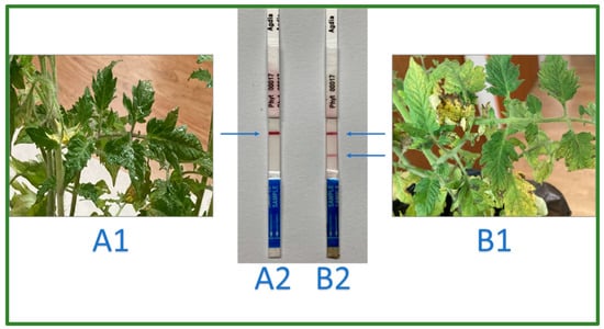 Detection of Phytophthora ssp. in tomato plants infected artificially with P. infestans via lateral-flow strips: A1, healthy plant (negative control); A2, negative strip; B2, positive strip; and B1, infected plant.