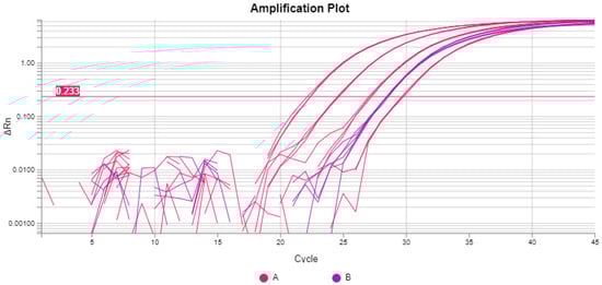 Real-time PCR quantification of Fusarium fungi in plant tissue: A, calibration standards (red); B, infected sample (violet).