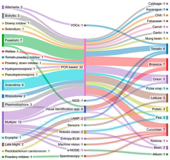 As a source of vitamins, minerals, and other nutrients, vegetables constitute an important food component that is produced and traded worldwide. As with other cultivated species, vegetables grow in tandem with beneficial or harmful microbiota that affect the yield and quality of crops. These microbiotas exist in fields, and the global movement of plant material (vegetable seeds, seedlings, and produce) provides opportunities for phytopathogens to cross borders and spread to new areas. It has been shown that the number of phytopathogens in different regions is associated with the volume of imports. In this way, the risk of pathogenic species expansion from one country to another has been increasing [,]. To prevent invasions, several control systems have been set up by national authorities, following the recommendations of scientists and international bodies []. Growers also try to prevent locally occurring plant pathogens from invading their crops, and they carefully monitor the possible spread of new phytopathogens from neighboring regions [].To successfully cope with vegetable pathogens, preventive measures should be taken, and consideration should be given to soil management, seed treatment, the cultivar’s natural resistance, and the various monitoring systems that are suited to conventional, biotechnological, and organic farming, forming part of the IPM recommendations []. The ability to capture the pathogen upon its first attack as early as possible, as in the early infection stage, allows growers to make appropriate and effective management decisions. It is apparent that tools for disease diagnosis and pathogen identification are greatly needed. Otherwise, it would not be possible to take preventative steps and set up management measures in cases of infection [].