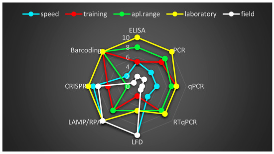 Other immunoassays, exploiting ready-to-use lateral-flow devices (LFDs), are now available on the market, in which specific antibodies are used for detection and color signaling. Such tests are well-known for their use in the monitoring of human diseases, e.g., COVID-19, and they are characterized by their ease of use. The results are easy to interpret; thus, they are commonly used for in-field diagnosis. The advantage of LFDs is that they can be used without the need for sophisticated instruments and equipment. These methods are characterized by their speed; they are considered to be rapid, while also being inexpensive and suited to high-throughput diagnostics (Figure 1). On the other hand, other approaches such as DNA-based methods are more sensitive and amenable to multiplexing. LFDs require a priori knowledge of each pathogen. Furthermore, the test is not suited to non-target screening.