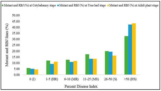 Percentage of mutant and resynthesized (RBJ) lines under different classes of percent disease index reactions at cotyledon, true leaf and adult plant growth stages.