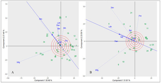 Principal component analysis (PCA) was carried out for the multi-locational trials to comprehend the impact of location-specific environments in terms of the resistance testing against A. candida isolates exclusively for the introgression, mutant, and resynthesized lines of B. juncea. The pattern of environments in connection to genotypes for white rust severity was visualized using GGE biplots based on symmetric scaling of genotype and environment. The GGE biplot graph used to evaluate white rust severity in the present study accounted for 57.9% of the total variation due to G + GE for ERJ and 55.3% for RBJ. In GGE biplot, environment vector lines connect the plot origin and markers for the environments. The correlation coefficient between two environments or genotypes is related to the angle between their vectors. While a perpendicular angle denotes no association and an obtuse angle demonstrates a negative correlation, an acute cosine angle suggests a positive correlation between the environment(s) or genotype(s). Therefore, according to the cosine of angles of environment vectors for ERJ, Wellington and S. K. Nagar (SKN) showed a positive correlation, while Wellington and Pantnagar were negatively correlated, suggesting they both have differing agro-climatic conditions for the development of the white rust disease (Figure 8A). However, in the case of RBJ and mutant lines, no correlation could be seen between Wellington and SKN as the environment vectors in this case formed a right cosine angle; instead, a positive correlation was seen between Ranchi and Wellington, while, similarly to ERJ, a negative correlation was found between Wellington and Pantnagar (Figure 8B).