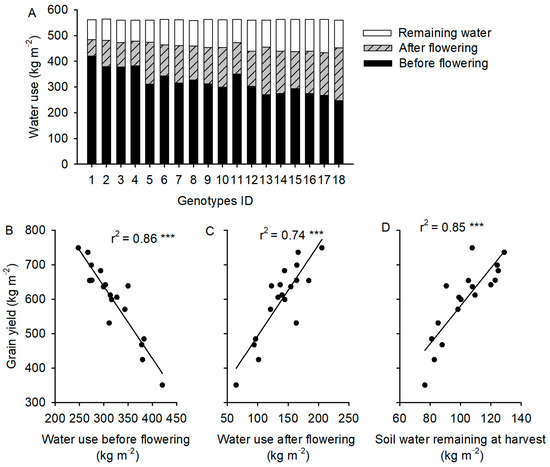 (A) Water use by 18 spring wheat genotypes from sowing to flowering, from flowering to maturity, and available water remaining in soil at maturity. Relationship between water use during the three periods and grain yield above (B–D). Vertical bars in (A) represent 18 genotypes arranged in ascending order of grain yield. Black dots and lines in (B–D) represents experimental data and linear fitting, respectively. ***, significant at p < 0.001.