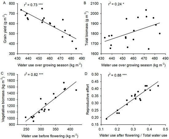 (A) Relationship between grain yield and water use over the entire growing season. (B) Relationship between total biomass and water use during the entire growing season. (C) Relationship between vegetative biomass and water use before flowering. (D) The relationship between reproductive effort and the ratio of water use after flowering to total water use during the entire growing season. Black dots and lines represents experimental data and linear fitting, respectively. *** and * significant at p < 0.001 and p < 0.05, respectively.