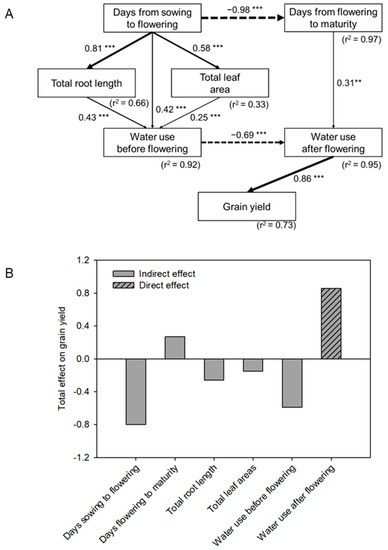 The structural equation modeling (SEM) of the effects of phenology, total root length, total leaf area, and water-use pattern before and after flowering on grain yield showed that water use after flowering positively affected grain yield (path coefficient 0.86). Water use before flowering had a negative indirect effect (via a negative direct effect on water use after flowering) on grain yield (−0.59). Total root length and total leaf area also had negative indirect effects (via positive direct on water use before flowering) on grain yield. The total effect was −0.26 and −0.15, respectively (Figure 4B). Tsf has a negative indirect effect on grain yield, while days from flowering to maturity had a positive indirect effect on grain yield.