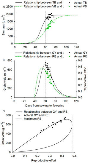 The relationship between total biomass (TB) and vegetative biomass (VB) and Tsf (t) among different genotypes was consistent with the logistic equation (Figure 5A): T (r2 = 0.31, p = 0.06); (r2 = 0.68, p < 0.001). Based on RB = TB − VB, we derived the relationship between grain yield and t. The relationship between grain yield and Tsf was unimodal (Figure 5B), with an optimum t (topt) of 60 days after sowing. The maximum grain yield was 712 g m−2, and the optimum RE was 0.44. If t is less than topt, the delay in flowering will increase grain yield; if t is greater than topt, the delay in flowering will decrease grain yield, although our data show only the latter part of the relationship (Figure 5B). The relationship between RE and flowering time was also unimodal, with RE peaking at 0.48 when t was 54 days (Figure 5B). Grain yield increased with an increase in RE, but topt for RE and grain yield were not the same. The derived relationship between grain yield and RE was a closed curve (Figure 5C).