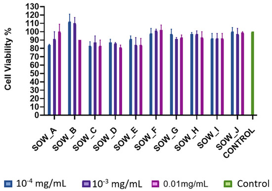 The ethanol, ethyl acetate, and methanol extracts showed cytotoxicity at 1 mg/mL, the highest concentration tested, with cell viability ranging in the mean between 45–60% (Figures S1 and S2), with the exceptions of the ethyl acetate extract of M. officinalis subsp. altissima (MOE) and methanol extract of S. perfoliata subsp. perfoliata (SPM) which did not show any cytotoxicity. All aqueous extracts and infusions (Figures S3 and S4) did not exhibit any cytotoxicity with the exceptions of R. officinalis aqueous extract (ROW) and the infusions of S. sipylea (SSI) and S. euboea (SEI), which were cytotoxic at the highest tested concentration (1 mg/mL).