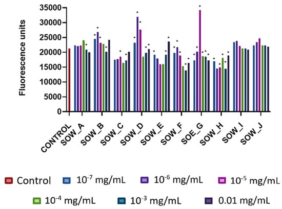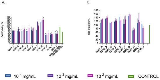The plant extracts and infusions did not demonstrate any cytotoxic effect at the concentrations from 10−5 to 0.1 mg/mL, apart from the ethyl acetate extract of R. officinalis (ROE), which showed a cytotoxic activity at a concentration of 0.1 mg/mL (Figures S1–S4).
