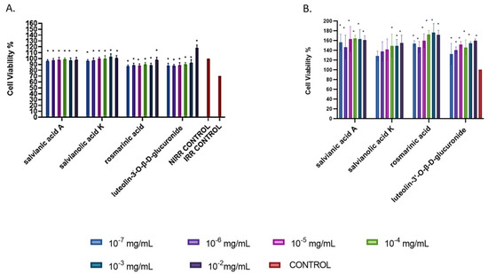Photoprotective activity of the isolated compounds (1–4) from S. officinalis. UV-A-induced cytotoxicity was assessed on mouse skin fibroblasts (NIH/3T3) pre-treated with the indicated compounds for 1 h (A). Compound—induced cytotoxicity after 1 h of treatment (B). PBS-treated cultures served as controls. UV-A untreated control (NIRR) set to 100%. Bars ± SD. * p < 0.05.