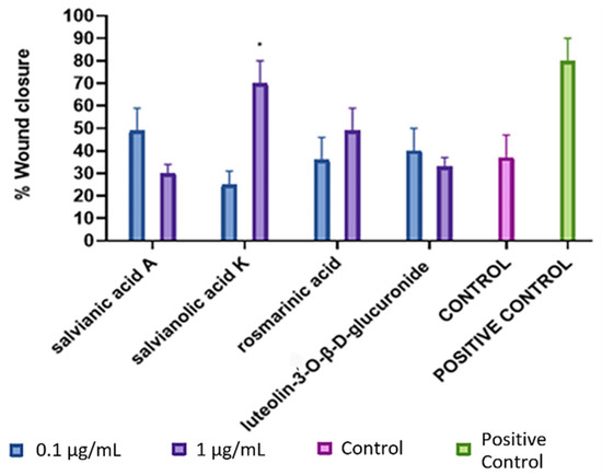 Wound-healing activity of the isolated compounds (1–4) from S. officinalis in NIH/3T3 fibroblasts. The data are expressed as mean of three experiments. Bars ± SD. * p < 0.05.