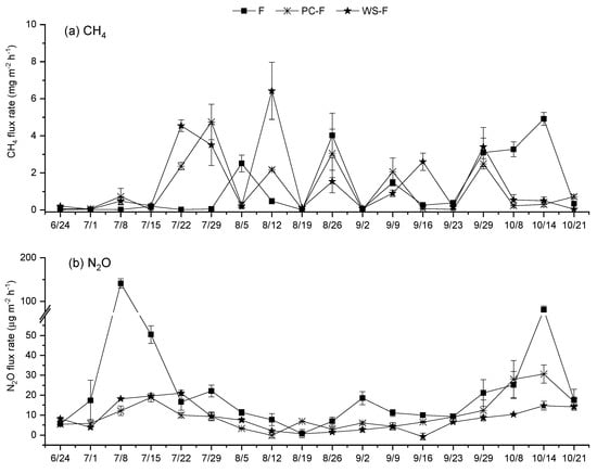 The flux rate of N2O for F showed the following two flux peaks: the first peak was 141.33 μg m−2 h−1 on 8th July and the second peak was 80.62 μg m−2 h−1 on 14th October (Figure 2b). Conversely, for PC-F and WS-F, two N2O flux peaks were observed for mid–late July and mid–late October. Additionally, the flux rate of N2O was lower in PC-F and WS-F than in F for most sampling times. The maximal flux rate of N2O was 21.08 μg m−2 h−1 for WS-F on 22 July and 28.01 μg m−2 h−1 for PC-F on 8th October. In general, the mean flux rate of N2O significantly decreased by 60.20% and 67.71% when using PC-F and WS-F in comparison to F, respectively (Table A1). Compared with F, the vegetable–fish co-culture significantly mitigated N2O emissions during the study period.