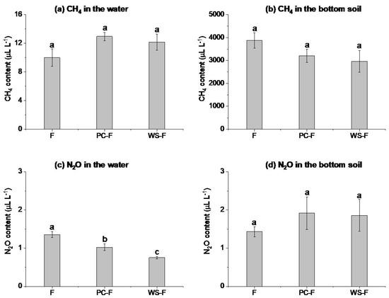 The concentration of CH4 in the water and bottom soil did not significantly differ between the fish monoculture and the vegetable–fish co-culture treatments (Figure 3). The content of N2O in the water significantly decreased by 24.39% and 44.41% when using PC-F and WS-F in comparison to F, respectively. This indicates that the vegetables primarily reduced the N2O in the water.