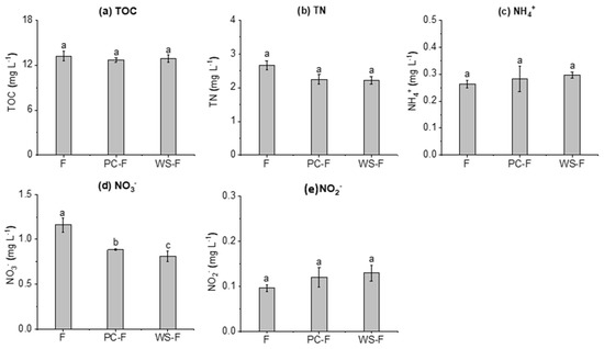 There were significant effects of the vegetable–fish co-culture on the content of NO3− in the water but no significant effects on the other parameters in the water and sediment (Figure 4 and Figure 5). The mean content of NO3− in the water was reduced by 23.67% and 30.08% when using PC-F and WS-F, respectively, as compared with F (Figure 4d).