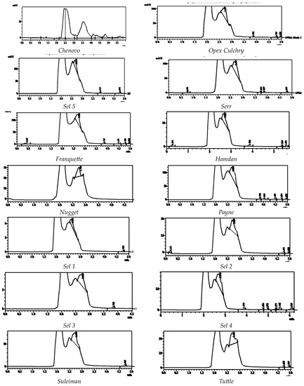 RP-HPLC chromatograms of 14 walnut genotypes.
