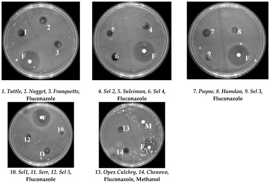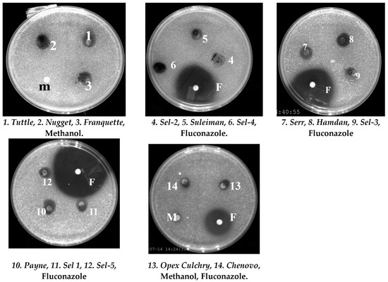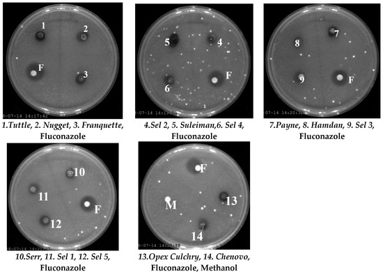 The diameter of inhibition zones ranges from 6.1 mm (Franquette) to 8.6 mm (Serr), with an average diameter of 7.3 mm. Ten genotypes (Nugget, Sel 2, Suleiman, Sel 4, Payne, Hamdan, Sel 3, Serr, Opex Culchry, and Chenovo) exhibited maximum inhibition zones ranging from 7.0 to 8.6 mm, and four genotypes (Tuttle, Franquette, Sel 1, and Sel 5) showed 6.1–6.5 mm zones of inhibition. The standard antifungal drug fluconazole was used as the positive control, and the zone of inhibition ranged from 19.0 to 21.2 mm (Table 4 and Figure 4).