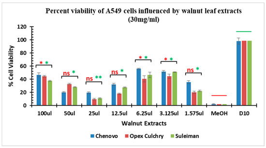 Antiproliferative activity of methanolic extracts (Chenovo, Opex Culchry, and Suleiman) against cancer cell line (lung A549); they were overall statistically significant [** p = 0.003] when compared to both MeOH and D10 controls. Using ANOVA analysis, data are represented as mean ± SD of results obtained from three independent experiments. * represents non-significant.