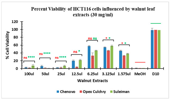 Antiproliferative activity of methanolic extracts (Chenovo, Opex Culchry, and Suleiman) against cancer cell line (colon HCT116); they were overall statistically significant [** p = 0.001] when compared to both MeOH and D10 controls. Using ANOVA analysis, data are represented as mean ± SD of results obtained from three independent experiments. * represents non-significant.