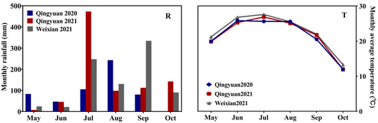 A two-year field experiment was conducted at Qingyuan experimental station (2020 and 2021) (115°47′ E, 38°76′ N) and Weixian experimental station (2021) (115°27′ E, 36°56′ N), Hebei Province, China. Table 1 shows the properties of the topsoil (0–20 cm) before planting in 2020 and 2021. Figure 1 shows the average rainfall and temperature of the cotton growing sites in 2020 and 2021. The average temperature and rainfall levels of the cotton growing season in Qingyuan 2020 were 21.57 °C and 93.12 mm, respectively. The average temperature and rainfall levels of the cotton growing season in Qingyuan 2021 were 21.78 °C and 146.55 mm, respectively; and the average temperature and rainfall levels of the cotton growing season in Weixian 2021 were 22.72 °C and 141.52 mm, respectively.