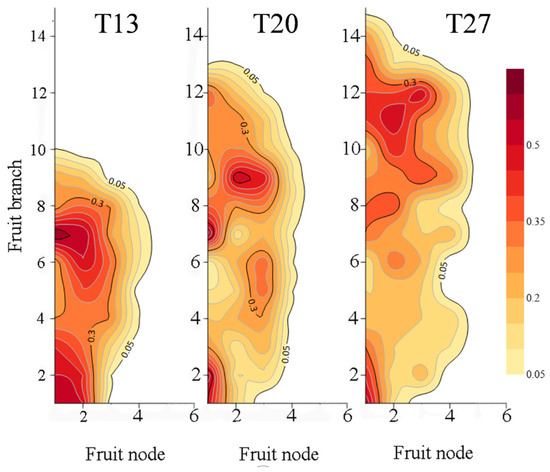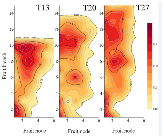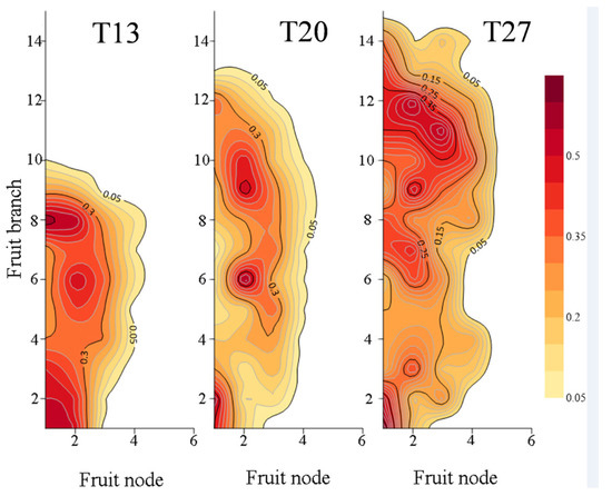 The plant topping dates affected the percentage of mid- and late-positioned bolls (Figure 2, Figure 3 and Figure 4). The T13 bolls were concentrated on the 6th to 8th fruiting branches; the T20 bolls were concentrated on the 9th and 10th fruiting branches; and the T27 bolls were concentrated on the 10th to 12th fruiting branches. The growth of cotton bolls exhibited the same trend (Figure 5). Early-topping (T13) increased the number of mid- and late-positioned bolls. In Weixian, heavy rainfall in September 2021 caused the cotton plants to shed many bolls and increased the number of upper-positioned bolls.