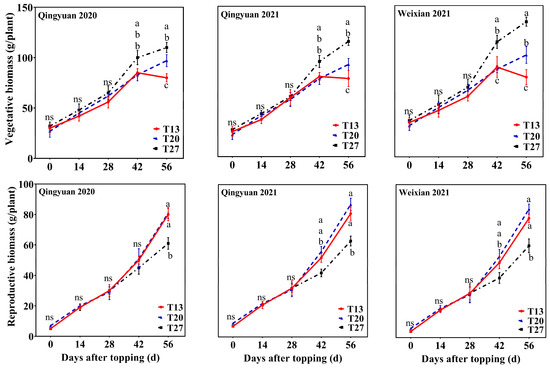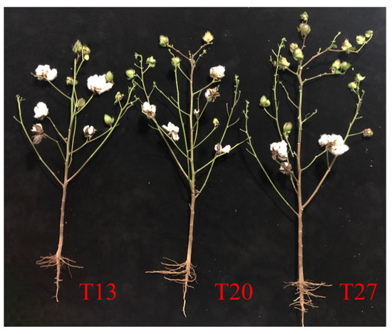 There were significant differences in vegetative and reproductive biomasses at 42 days after topping, with a significant decrease and increase in vegetative biomass and reproductive biomass for T13 plants, respectively. The reproductive biomass for T13 plants at 42 and 56 days after topping was increased by 19.84% and 29.89%, respectively, relative to those of T27 and T20 plants (p < 0.05). The reproductive biomass for T20 plants was slightly higher than that of T13 plants; however, the difference was not significant. The reproductive organs of cotton plants had a higher distribution of dry matter.