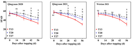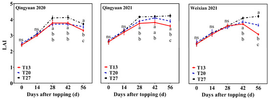 The LAI first increased and then decreased after plant topping in all treatments (Figure 8). In Qingyuan, LAI reached the maximum levels in all plots 28 days after topping in 2020 and 2021. The LAI for T13 plants at 42 and 56 days after topping decreased by 3.59% and 15.83%, respectively, and by 9.02% and 26.82% relative to those of T20 and T27 plants (Qingyuan 2020) (p < 0.05). The LAI for T13 plants at 42 and 56 days after topping decreased by 6.98% and 7.92% and by 8.98% and 15.20%, respectively, relative to those of T20 and T27 plants (Qingyuan 2021) (p < 0.05). In Weixian, LAI was at its maximum level 42 days after topping. The LAI for T13 plants at 42 and 56 days after topping decreased by 1.73% and 6.70%, respectively, and by 8.51% and 11.01% relative to those of T20 and T27 plants (Weixian 2021) (p < 0.05).