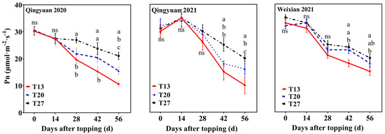 Plant topping dates significantly affected the net photosynthetic (Pn) rates for the cotton plants. Late-topping significantly reduced the Pn of functional leaves of the main cotton stem (Figure 7). In 2020, there were significant differences in Pn 28 days after topping in Qingyuan. The Pn for T13 plants 28, 42, and 56 days after topping were 9.52% and 25.12%, 34.78% and 27.13%, and 32.25% and 47.22% lower than those of T20 and T27 plants, respectively (Qingyuan 2020) (p < 0.05). In 2021, there were significant differences in Pn 42 days after topping in Qingyuan. The Pn for T13 plants 42 and 56 days after topping were 16.67% and 39.81%, respectively, and 37.51% and 42.11% lower than those of T20 and T27 plants (Qingyuan 2021) (p < 0.05). In Weixian, significant differences in Pn were noted 42 days after topping. The Pn for T13 plants 42 and 56 days after topping were 21.74% and 16.67%, respectively, and 25.00% and 25.00% lower than those of T20 and T27 plants (Weixian 2021) (p < 0.05).