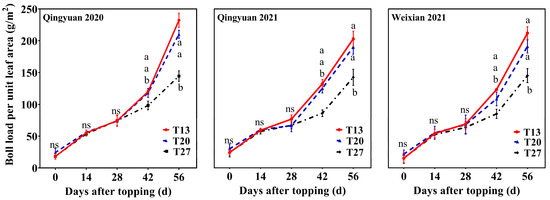 The plant topping date significantly affected the boll load per unit leaf area (Figure 9). The boll load per unit leaf area for T13 plants at 42 days after topping was significantly higher than those of T20 and T27 plants. The boll load per unit leaf area for T13 plants at 56 days after topping was increased by 66.18% and 28.74%, respectively, relative to those of T20 and T27 plants (p < 0.05).