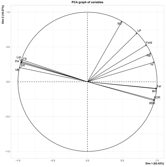 Principal component analysis (PCA) of cotton growth, yield, and quality. BSR, boll formation rate; BOR, boll opening rate; BW, boll weight; Ear, earliness; HI, harvest index; RB, reproductive biomass; Yield, seed cotton yield; LP, lint percentage; BD, boll density; FB, fruit branches; LAI, leaf area index; PH, plant height; SR, expulsion rate; VB, vegetative biomass.