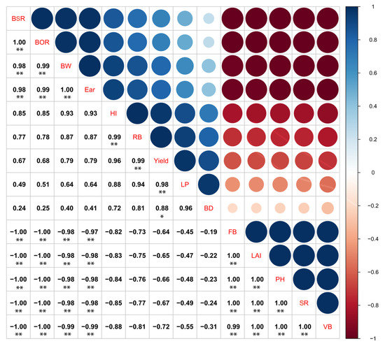 The matrix of Spearman’s correlation coefficients and 95% confidential intervals. BSR, boll formation rate; BOR, boll opening rate; BW, boll weight; Ear, earliness; HI, harvest index; RB, reproductive biomass; Yield, seed cotton yield; LP, lint percentage; BD, boll density; FB, fruit branches; LAI, leaf area index; PH, plant height; SR, expulsion rate; VB, vegetative biomass. Significant differences are denoted by * (p < 0.05), and ** (p < 0.01).