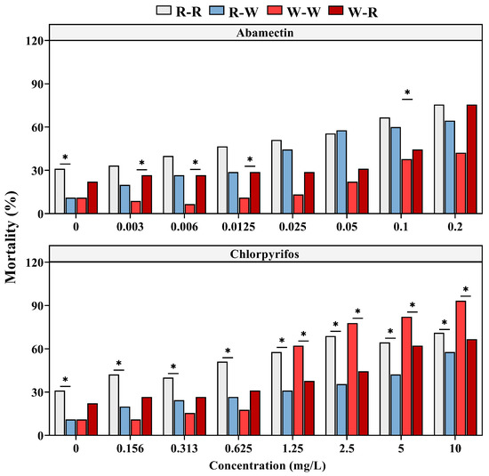 Effects of two insecticides on the mortality of Cnaphalocrocis medinalis larvae from different host-plant switch treatments. Asterisks indicate significant differences in mortality between different host-plant switch treatments at the same concentration (chi-square test; p < 0.05).
