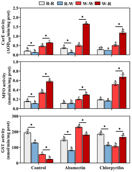 In this study, an investigation of the relationship of the toxicities of abamectin and chlorpyrifos to C. medinalis larvae in rice and wheat populations with host-plant switching was conducted, as well as the activities of carboxylesterase (CarE), multifunctional oxidase (MFO), glutathione S-transferases (GSTs), superoxide dismutase (SOD), peroxidase (POD), catalase (CAT), and acetylcholinesterase (AChE) (Figure 1). Our results contribute to deepening understanding of the relationship between the susceptibility of C. medinalis larvae to insecticides and their host plants, further clarifying the role of host adaptation of pests in the formation of insecticide resistance and providing a theoretical basis for the formulation of pest-control strategies.