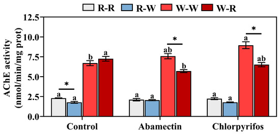 Two-way ANOVA revealed that AChE activity of C. medinalis larvae was significantly affected by host-plant switch treatment and insecticide treatment and that there was interaction between them (Table 3). The AChE activity of C. medinalis larvae in the rice population decreased significantly after the host plant was changed to wheat (t = 4.352, df = 4, p = 0.012) but not in the wheat population (t = 1.268, df = 4, p = 0.273), suggesting that the effect of host-plant switching on the AChE activity of C. medinalis larvae depends on the original host (Figure 4). Abamectin and chlorpyrifos treatment at sublethal concentrations did not affect the AChE activity of rice-population larvae, regardless of host-plant switching, but affected the AChE activity of wheat-population larvae. When exposed to abamectin and chlorpyrifos at the LC25, the AChE activity of wheat-population larvae fed on wheat increased significantly (F2,6 = 9.987, p = 0.012), but the AChE activity of wheat-population larvae decreased significantly after the host plant was converted to rice (F2,6 = 9.517, p = 0.014) (Figure 4).