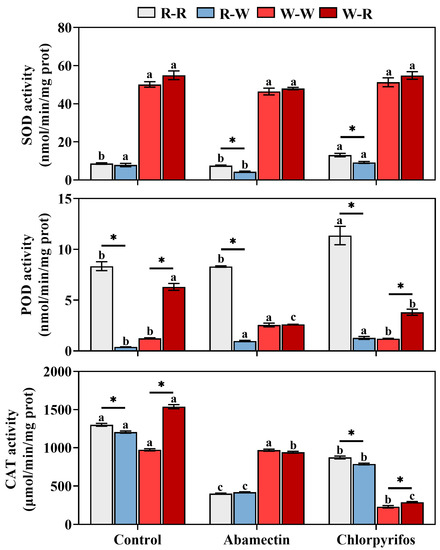 Effect of insecticides on the antioxidant enzyme activity of Cnaphalocrocis medinalis larvae from different host-plant switch treatments. Asterisks indicate significant differences in the antioxidant enzyme activity of larvae after host-plant switch treatments. Different lowercase letters indicate significant effects of different insecticides on larval antioxidant enzyme activity under the same host-plant switch treatment.