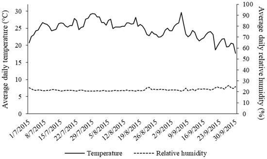 For the trial, twenty fields were sown in the middle of April with five cotton hybrids, namely, hybrids ST 402 (eight fields), ST 405 (one field), ST 474 (three fields), ST 373 (two fields) (Pioneer Hi-Bred Hellas S.A.), and Babylon (six fields) (House Of Agriculture Spirou S.A.). Common crop care measures were applied to all fields. Contact insecticides, e.g., chlorantraniliprole, chlorpyriphos, and cypermethrin, are commonly applied in the study area during the larval stages of H. armigera. However, during this specific growing period, the insecticidal applications were reduced in comparison with the previous years. Trap monitoring was initiated in the middle of July and was terminated at the end of September. The average daily air temperature during the trial ranged from 17.7 to 29.6 °C, whereas average daily relative humidity was low and did not exceed 26%. Not surprisingly, the highest average daily temperatures were recorded in July and August and were 29.3 and 28.3 °C, respectively (Figure 2). The lowest level of rainfall was recorded in July (11.9 mm), whereas monthly precipitation increased to 50.8 and 74.9 mm in August and September, respectively. The climatic data were provided by the meteorological station of the Vardates Agricultural Research Station of the National Agricultural Research Foundation (NAGREF) (Vardates, Phthiotida, Greece).