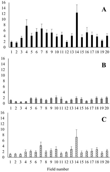The total captures of adults of H. armigera per field were characterized by high variation among the fields. Indicatively, the highest total number of captures throughout the study was recorded in field 14 [347 adults], whereas only 57 adults were collected from the traps installed in field 2. The average number of captures in each field in the striped, green, and colored trap are presented in Figure 3 (A, B and C, respectively). The average number of captures per field in the striped trap ranged from 1.6 to 12.3 adults, whereas the respective figures for the green and colored traps fluctuated between 0.5 and 2.1 and 1.0 and 7.2 adults, respectively (Figure 3).