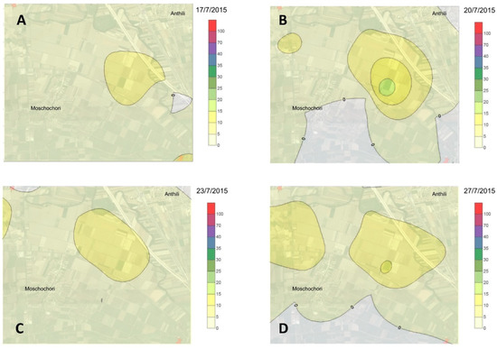 The spatio-temporal distribution of the H. armigera population in July in terms of total captures in all trap types is presented in Figure 4. In the first trap check-date, a low number of captures was recorded, indicating a low population density (Figure 4A). It should be noted that this trap check-date coincided with sporadic rainfall in the region. In the following trap inspection dates, the gradual spread of H. armigera was observed (Figure 4B,C), whereas, in the last trap check for this month, the insect population spread was expanded also to the northwest side of the study area (Figure 4D). In August, the population density of H. armigera was considerably increased with most of the captures occurring in the northeast and northwest side of the study area (Figure 5). A peak of the H. armigera population was observed in the beginning and middle of September, with the highest number of captures in the first case being recorded in the traps installed in the central part of the study area and in the second case in the northeast and northwest side (Figure 6).