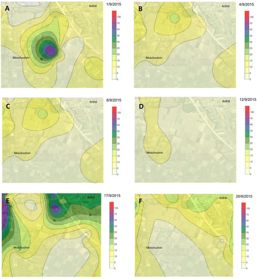 Spatio-temporal distribution of the population of Helicoverpa armigera male adults in the study area in September 2015 ((A): 1 September 2015, (B): 4 September 2015, (C): 8 September 2015, (D): 12 September 2015, (E): 17 September 2015, and (F): 20 September 2015).