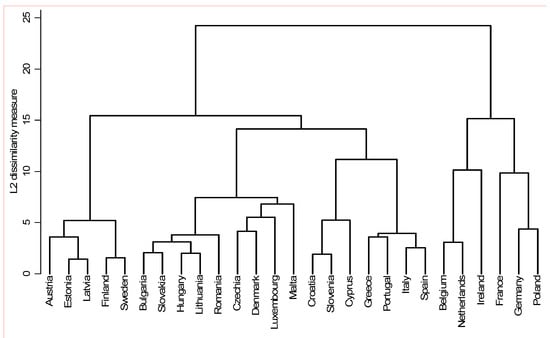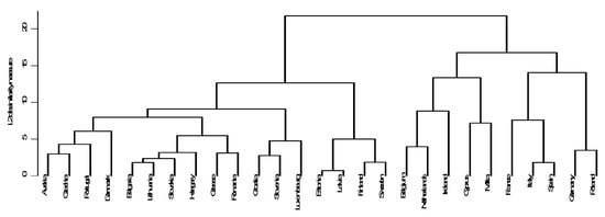 There are numerous kinds of clustering methods. In this study, the STATA programmer (Stata 12.32, software package created in 1985 by Stata Corp, College Station, TX, USA) was used. It utilizes two principal methods: one is the K-Means Cluster method and the other is the hierarchical Cluster (HC) method [40]. A comparative analysis of the dynamics and structure of the 27 Member States with different levels of intensification of agricultural productions was carried out with Ward’s method [41] of measuring squared Euclidean distance.