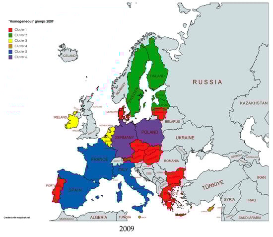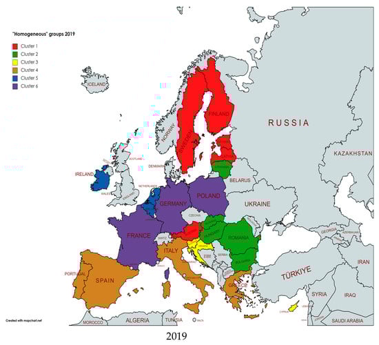 The 2019 cluster analysis conducted on the main PCs also generated six “homogeneous” groups of countries (Figure 3 and Figure 4).