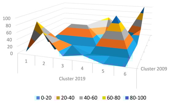 Table 6 shows that most EU countries have not remained in the same groups. The percentage value that appears in the transition Markoviana matrix [43] indicates the number of times a country that belonged to one of the initial groups in 2009 passed into the same group in 2019. The most obvious element with reference to the transition matrix (TM) is that many countries have moved from their original group. Indeed, in the first row of the TM, for example, only Austria (A) of the twelve EU countries that in 2009 were in Cluster 1 remained in the same cluster in 2019. Seventy-five percent (Bulgaria, Czech Republic, Denmark, Hungary, Lithuania, Luxemburg, Malta, Romania and Slovakia) passed to Cluster 2, and just two countries (Croatia and Greece) passed to Clusters 3 and 4, respectively. The second line shows that 80% (Estonia, Finland, Latvia and Sweden) of the five countries that in 2009 belonged to Group 2 migrated to Group 1; the remaining 20% (Slovenia) moved to Group 3. The figures in the third line indicate that the three countries (Belgium, Ireland and the Netherlands) that belonged to Group 1 in 2009 had moved to Group 3 by 2019. The fourth line shows that the two countries (Cyprus and Malta) that in 2009 were in Cluster 4 passed to Clusters 2 and 3, respectively. The fifth line shows that the three countries (France, Italy and Spain) that belonged in 2009 to Group 5 had moved to Group 4 (Italy and Spain) and 6 (France), respectively. Lastly, the sixth line shows that the two countries (Germany and Poland) that belonged to Group 6 in 2009 had remained in Group 6 by 2019. A process of divergence has therefore occurred. The TM allowed a three-dimensional graph to be drawn (Figure 5).