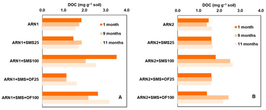 Dissolved organic carbon content, DOC (mg g−1 soil), of unamended soils (ARN1 (A) and ARN2 (B)) and soils amended with SMS or SMS + OF at two doses (25 and 100 Mg ha−1) at 20, 103, and 215 days after fungicide application.