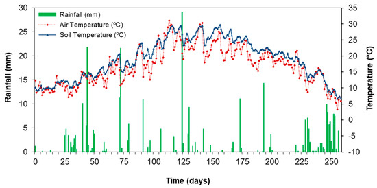 Figure 2 shows the values for precipitation, and air and soil temperature over the experimental period (258 days) recorded by an in situ weather station. The climate at these experimental sites in La Rioja is dry and warm, with a Mediterranean influence. The air and soil temperatures recorded were 42.3 °C and 33.0 °C (maximum) and −3.0 °C and 5.4 °C (minimum) (mean 16.9 °C and 19.0 °C); the maximum daily precipitation recorded was 29.1 mm at 124 days, and the total cumulative precipitation was 313.7 mm.
