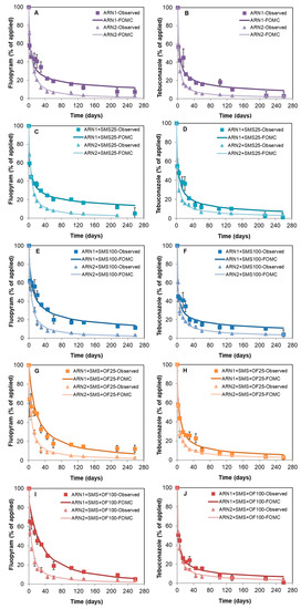 Dissipation kinetic curves of fluopyram (A,C,E,G,I) and tebuconazole (B,D,F,H,J) in unamended soils (ARN1 and ARN2) and soils amended with SMS or SMS + OF at rates of 25 and 100 Mg ha−1. The data observed and the curves obtained from fitting the data to the FOMC kinetic model are included in graphs.