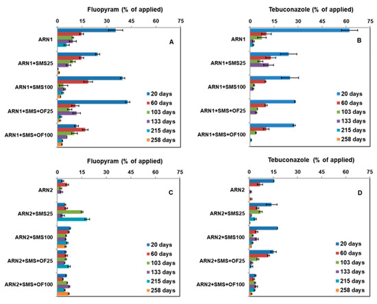 The mobility of fluopyram and tebuconazole in unamended and amended soils was studied from the concentrations determined at the 15–30 cm soil depth at different times (20, 60, 103, 133, 215, and 258 days) after fungicide application (Figure 4).