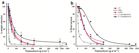 - Palma-Bautista, C.; Tahmasebi, B.K.; Fernández-Moreno, P.T.; Rojano-Delgado, A.M.; Alcántara de la Cruz, R.; De Prado, R. First case of Conyza canadensis from Hungary with multiple resistance to glyphosate and flazasulfuron. Agronomy 2018, 8, 157. [Google Scholar] [CrossRef]