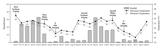 The experiment was carried out in southeastern Brazil (22°42′ S, 47°18′ W, and 570 m altitude) in a in a Red-Yellow Argisol–Ultisol [11,12] in an area of degraded grassland composed of Signal grass (Urochloa decumbens), Palisade grass (Urochloa brizantha), and the Leucaena legume (Leucaena leucocephala). According to the classification of Köppen, the local climate is “Aw” type, which stands for rainy tropical forest with rains in the summer and droughts in the winter [13]. From August 2019 to September 2021, soybean was grown without nitrogen application in summer, and maize fertilized with nitrogen as side-dressing was grown in autumn–winter. The crops were named as the first soybean crop (2019/2020) and second soybean crop (2020/2021), as well as the first maize crop (2020) and second maize crop (2021). Figure 1 shows the maximum and minimum temperatures and rainfall during the experimental period.