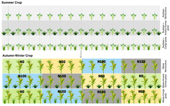 The treatments were arranged in a randomized complete block design in a split plot scheme, with four replications. The main plots consisted of the following treatments: (1) soybean monoculture–maize monoculture; (2) soybean intercropped with Aruana Guinea grass (Megathyrsus maximum cv. Aruana)–maize intercropped with Aruana Guinea grass; and (3) soybean intercropped with Congo grass (Urochloa ruziziensis cv. Comum)–maize intercropped with Congo grass. The subplots consisted of four nitrogen rates (0, 50, 100, and 150 kg ha−1) applied as side-dressing in rows of maize and tropical grass in the autumn–winter season about 30 days after planting, when the maize plants had 5–6 fully expanded leaves (Figure 2). The experimental plots were 72 m2 (3.6 m × 20 m).